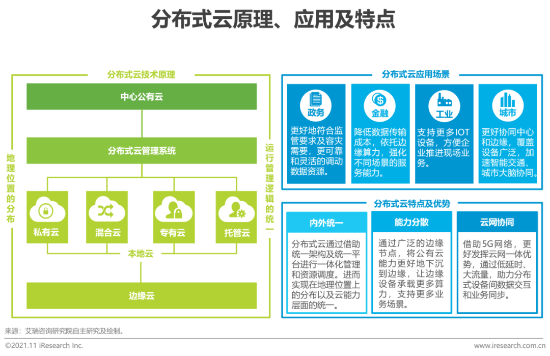 云部署形态持续进化,从早期的公有云及私有云,陆续延伸出专有云、分布式云等不同形态。其本质在于如何平衡公有云能力分布不均衡及管理调度局限性的问题。在分布式云之前,企业更倾向通过部署混合云搭配多云管理的方式,云的“割裂”仍造成企业运营及后期运维困难。分布式云则有效平衡了物理位置的分布与运行管理逻辑的统一。通过统一架构及平台,将公有云的能力更广泛的输出。